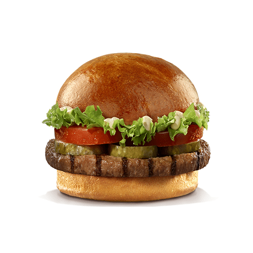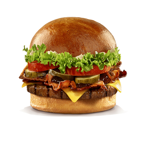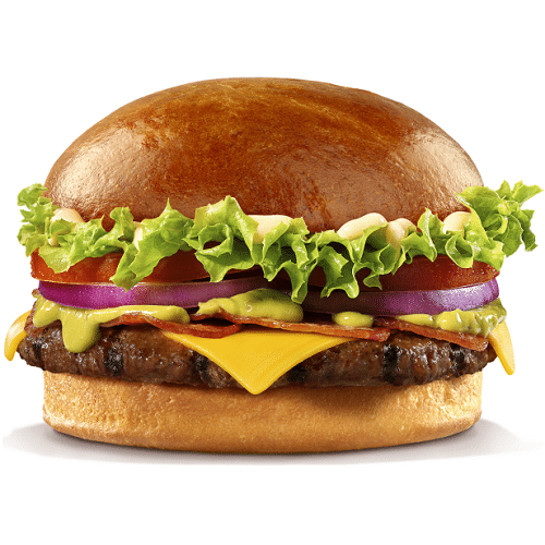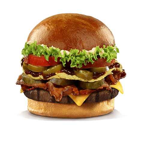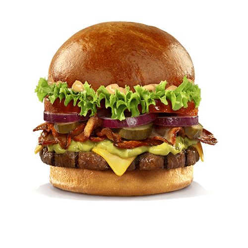Briochie-Brötchen, 125g Rindfleisch, belegt mit Salat, frischen Tomaten, frischten roten Zwiebeln, Chesterkäse, Bacon, Guacomole und Bulls Sauce