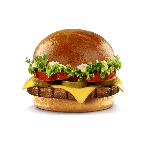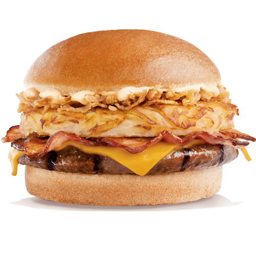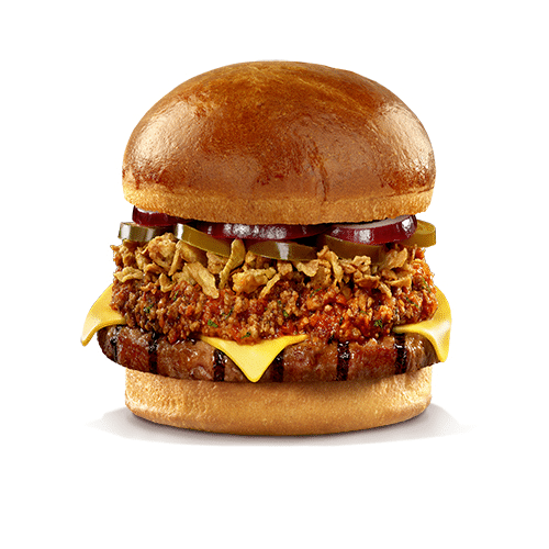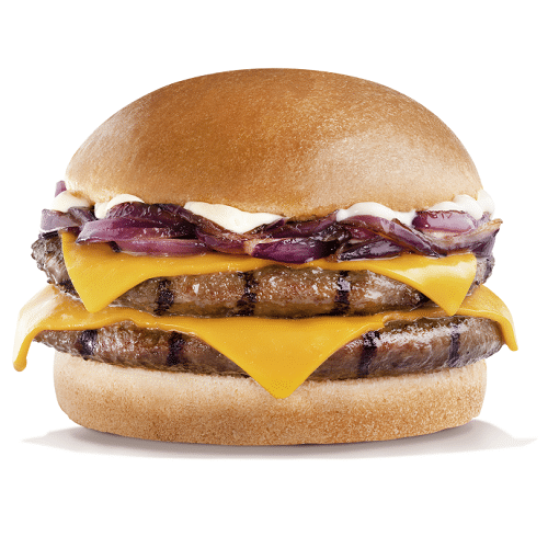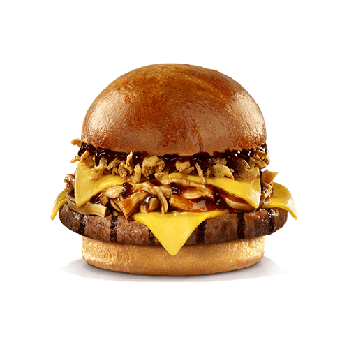 Briochie-Bröthcen, 2x 125g Rindfleisch, belegt mit karamellisierten Zwiebeln, 2x Chesterkäse und Bull Sauce