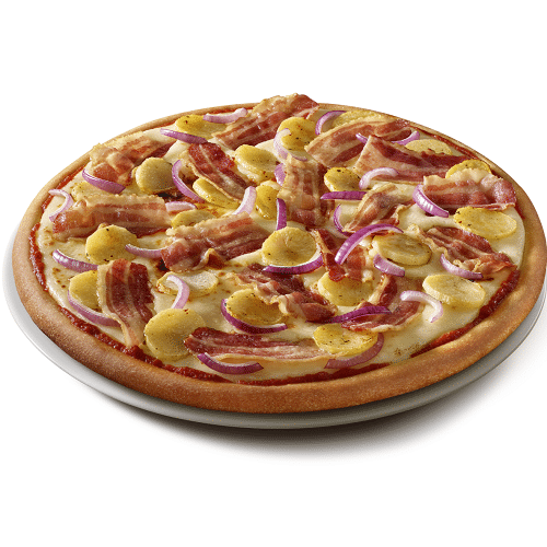 Pizzateig belegt mit BBQ Sauce, frischen roten Zwiebeln, Käse, Potato Wedges und Bacon
