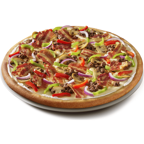 with ham, olives, fresh mushrooms, fresh bell pepper, salami, fresh red onions, peppers, fresh tomatoes, corn, beef and extra cheese
