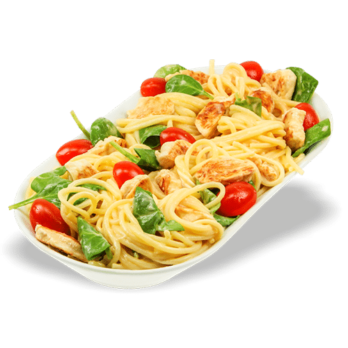 mit Nudeln nach Wahl, Pesto-Sahnesauce, Kirschtomaten, Blattspinat, Chicken und Gouda