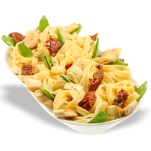 mit Nudeln nach Wahl, Pesto-Sahnesauce, Zuckerschoten, getrockneten Tomaten, Chicken und Gouda