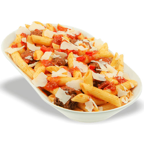 mit Nudeln nach Wahl, scharfer Tomatensauce, Hackbällchen und Parmesanflocken