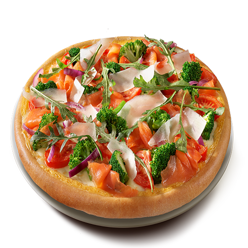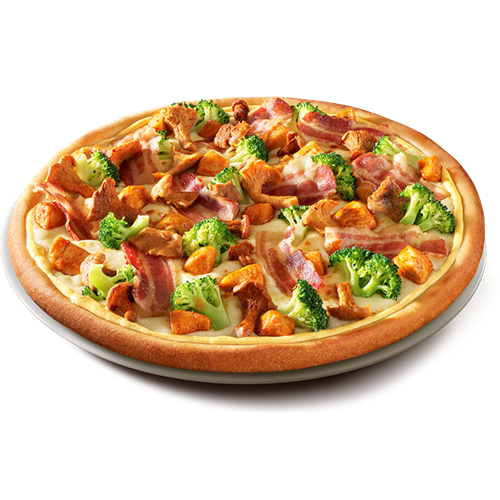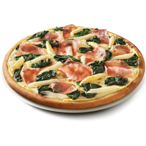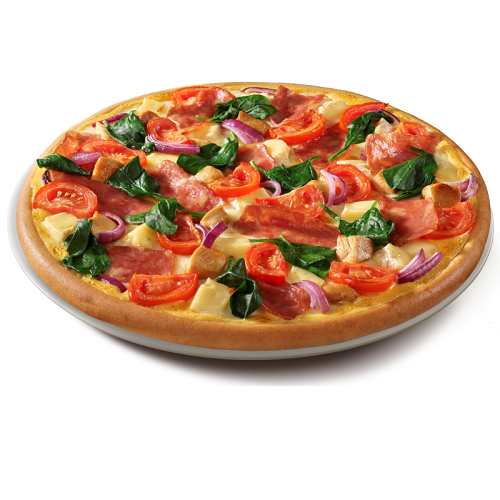 pizza dough topped with Hollandaise sauce, spinach, cherry tomatoes, fresh red onions, cheese, bacon, chicken breast and camembert
