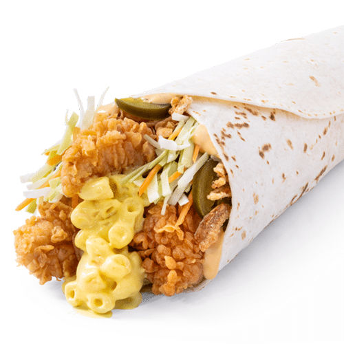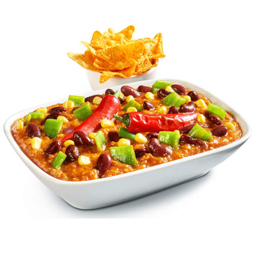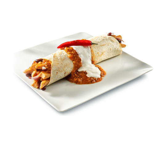 Weizentortilla mit Bolognesesauce, frischen roten Zwiebeln, Kidneybohnen, Chicken, Mais, Käse, Creme Fraiche und Chilischoten