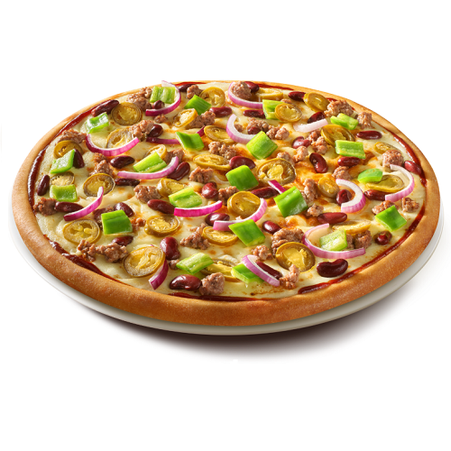 with barbecue sauce, bacon, jalapenos, pepperoni salami, red onions and beef