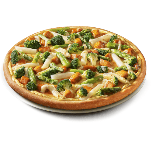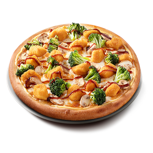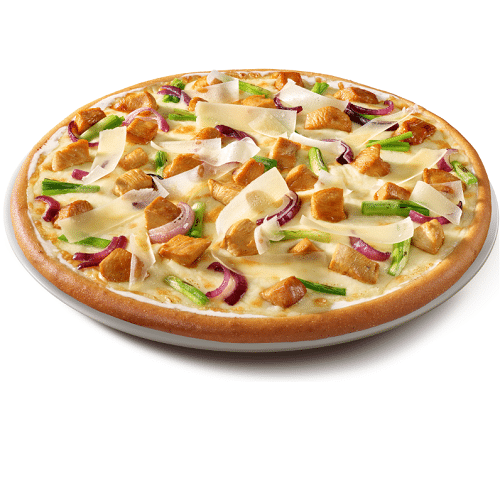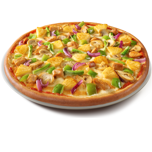 pizza dough topped with pizza sauce, pineapple, fresh mushrooms, fresh peppers, fresh red onions, cheese, chicken breast and after the oven spring onion slices