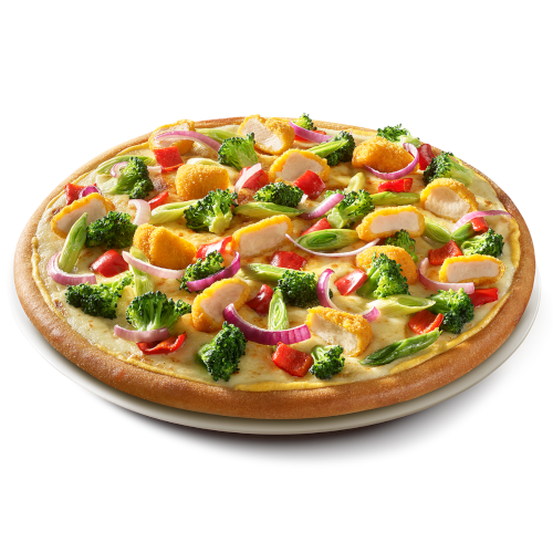 Pizzateig belegt mit Curry Sauce, frischen roten Zwiebeln, frischem Paprika-Mix, Broccoli-Röschen, Gouda und Chickenstrips